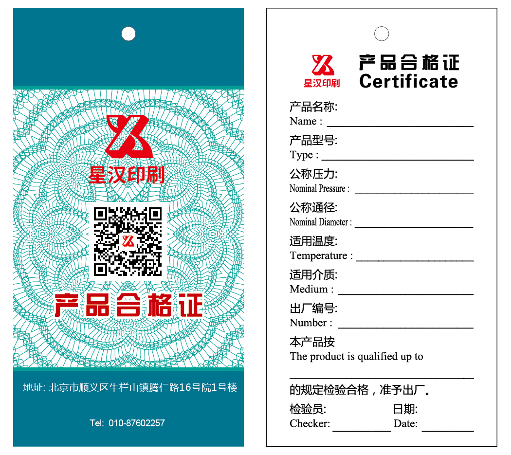 (6)从印刷角度讲,防伪合格证有以下几种:实线专色印刷(不同于传统的四色网点印刷,易识别)、四色、专色、彩虹印刷、丝网印刷、凹印等。