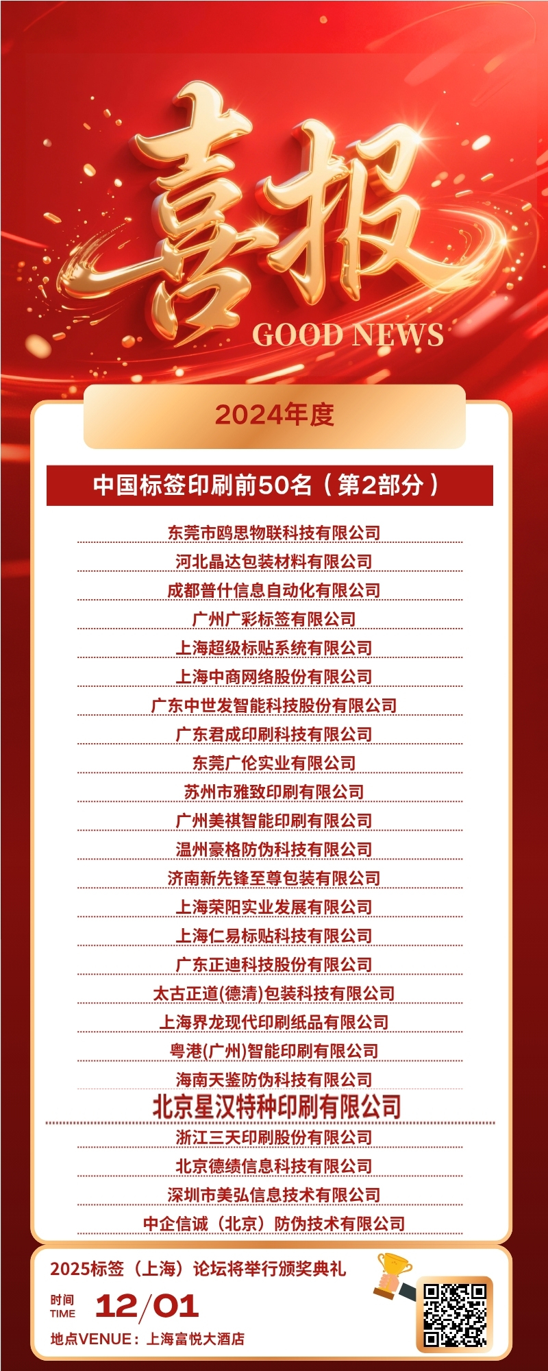 喜讯:我司荣获“2024年度中国标签印刷前50名企业”