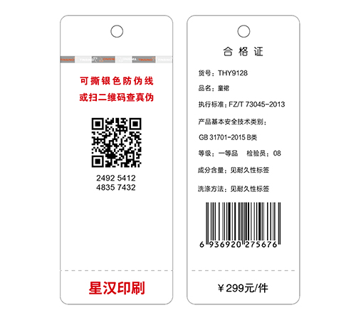 双线安全线防伪是当前最新防伪技术之一,其安全级别等同与人民币防伪安全线级别。最大的特点就是安全级别高,防伪效果好,还有就是易于鉴别。其实这一点很重要,因为防伪主要是做给消费者看的,是企业提供给消费者区分真假的认知工具,目的是让消费者不受假冒伪劣产品的蒙蔽。要提高消费者鉴别积极性,提高鉴别率,使主动识别、拒绝、打击假冒成为可能,那防伪特征就必须能够让任何层次的消费者、管理者无需借助任何仪器、工具或支付额外费用都能亲自简单、准确地识别、而且结论准确可靠。因此,安全线防伪技术是当前最好的防伪措施之一。 将这项技术运用到了收拾吊牌、衣服吊牌中,也受到了客户的青睐。